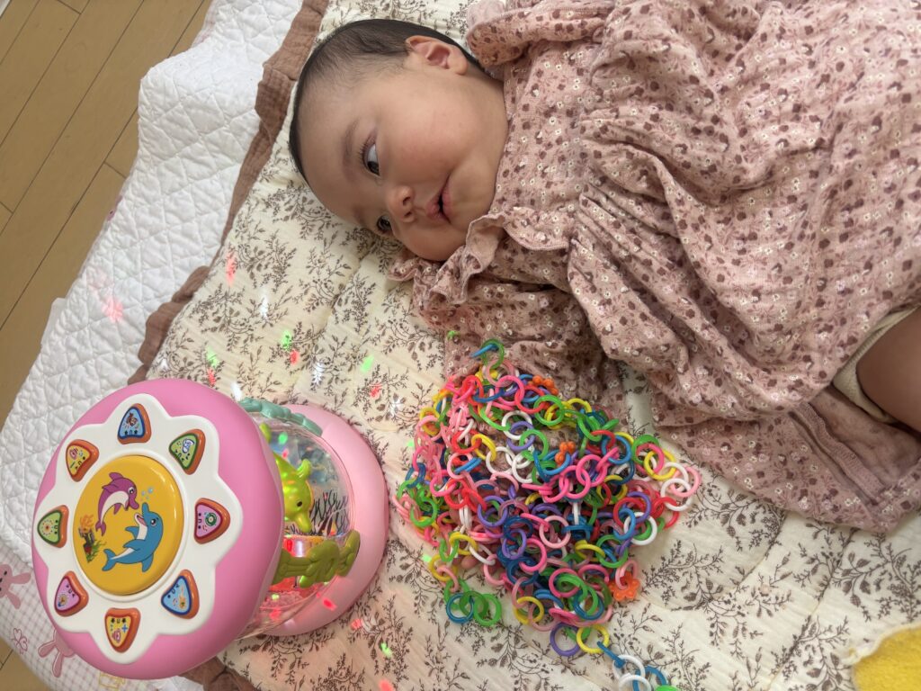 その後は、おひざの上やバンボに座って、周りをよく見たり、おもちゃに触れたりして、遊んでいました♪