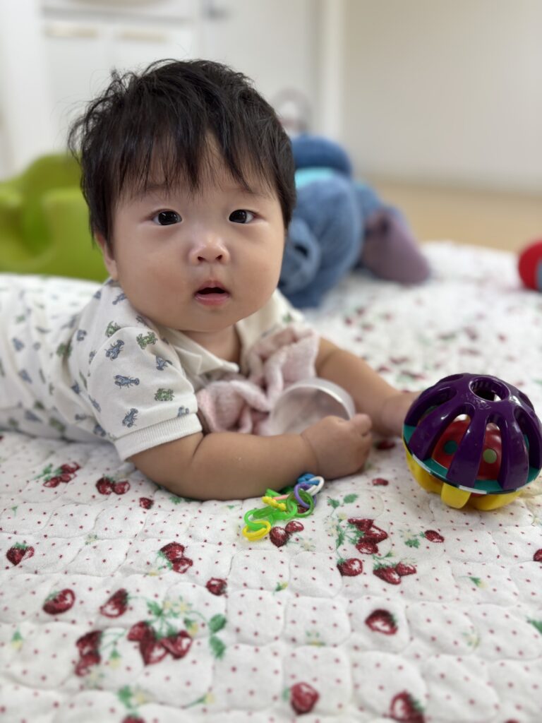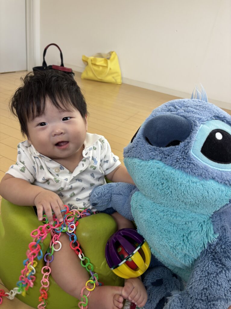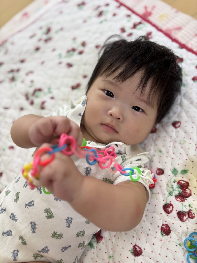上手におすわりやはいはいができるようになっていて、鏡のところは行き、ご自身のお顔を見て笑ったり、音が鳴るおもちゃを取りに行ったり活発に過ごせました。