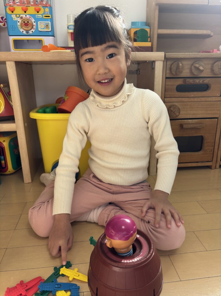 YouTubeで見た黒髭のおもちゃで遊びました。黒ひげが飛び出すたびに大笑いしちゃいました。