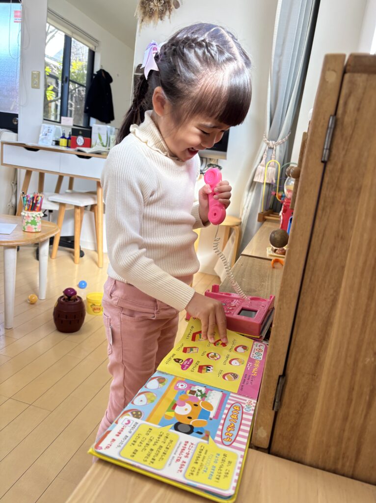 「前に来た時にこのおもちゃ好きだったんだよね」と教えてくれて、お店屋さんごっこのやりとりを楽しみました。