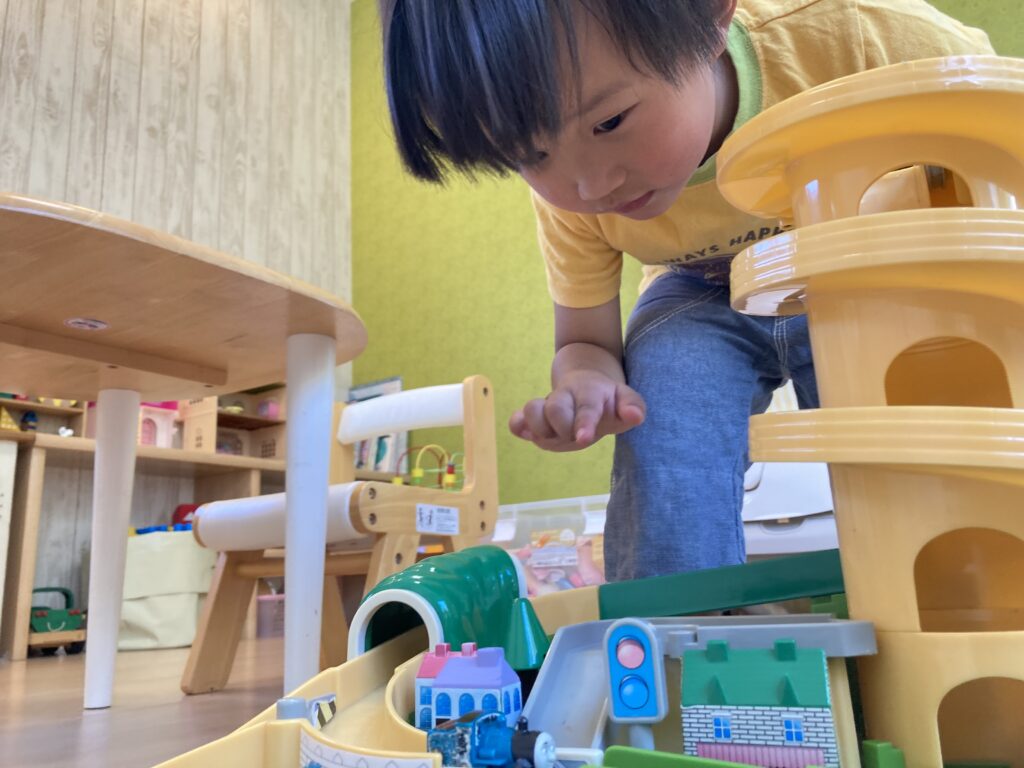 遊べるか心配してくださったお母様が、タブレットを持たせてくださいましたが「コレで遊びたい!」と、トーマスのおもちゃですぐに遊び始めました♪