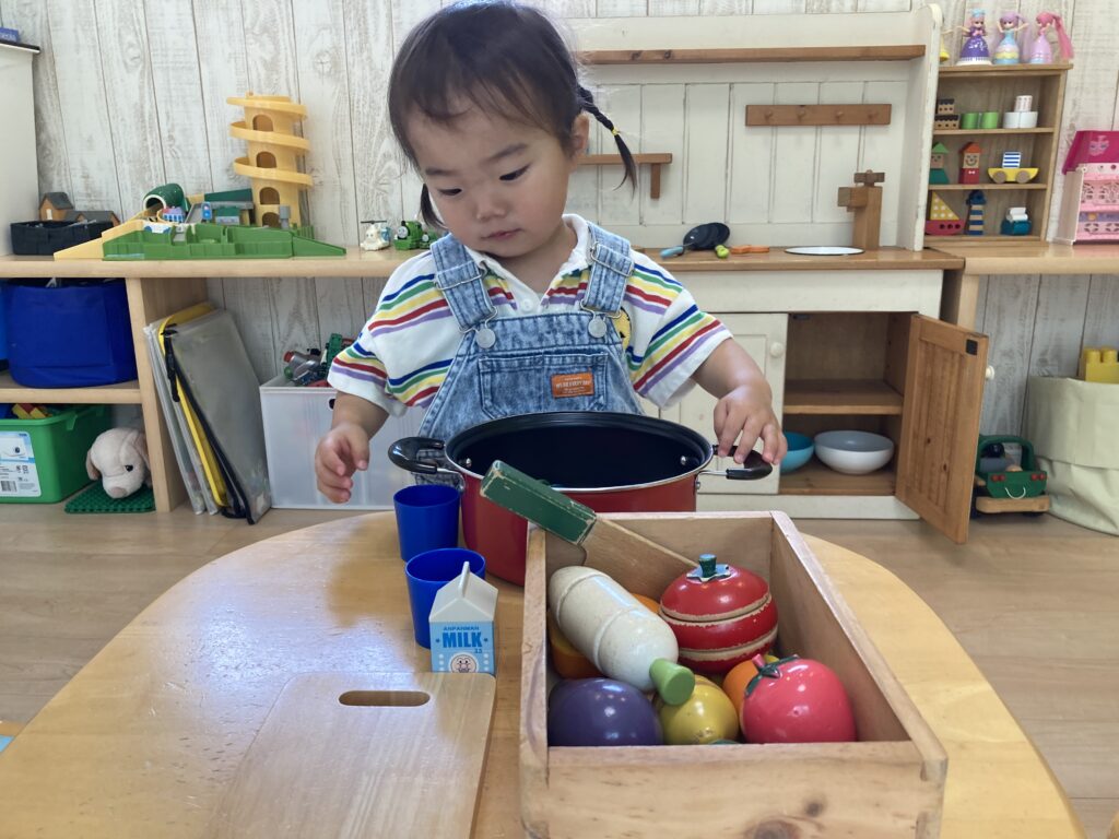 いつもおままごとがとても上手なので、机の上におままごとのおもちゃをセットして、落ち着くのを待っていたら…