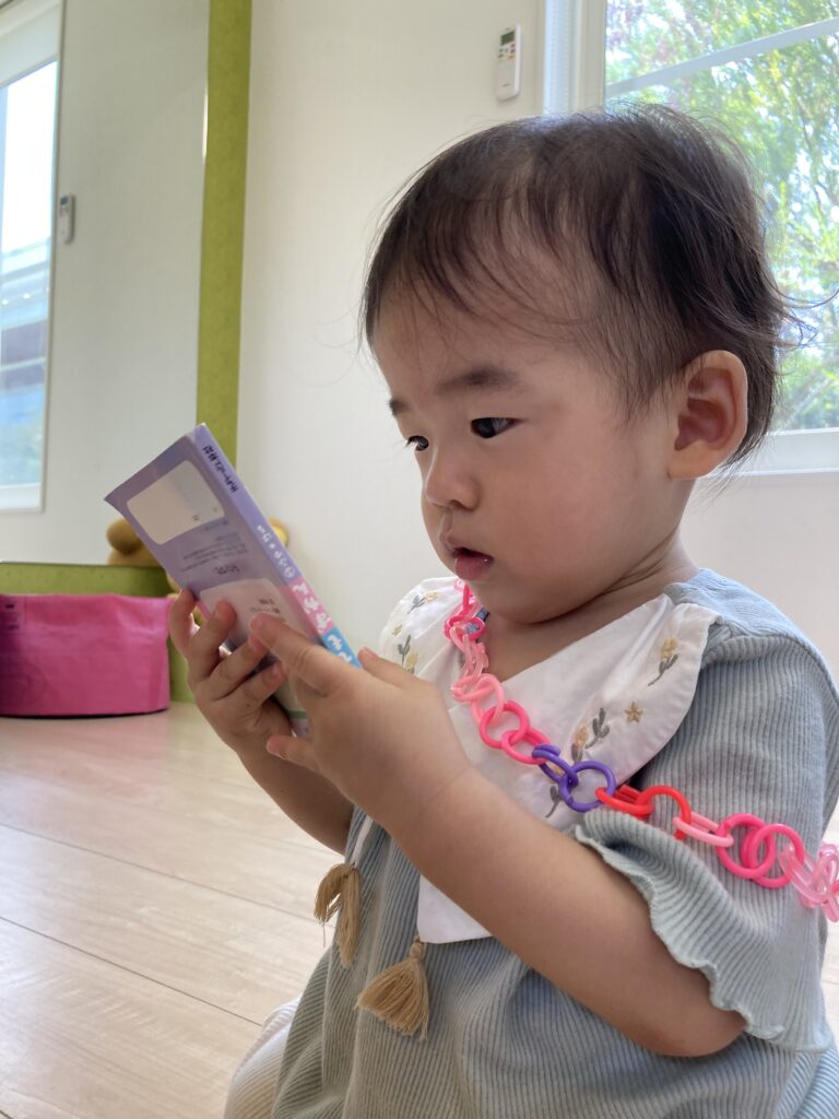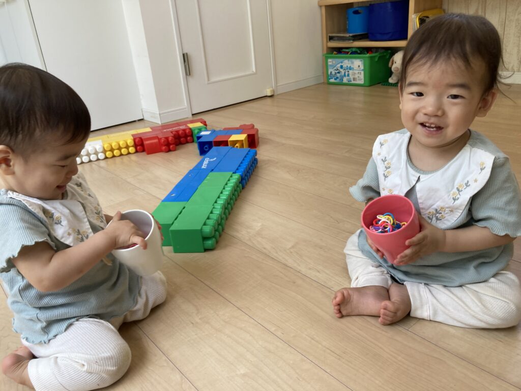 少しお部屋に戸惑いを見せて、おもちゃの遠くから手を伸ばす姿が可愛いですね