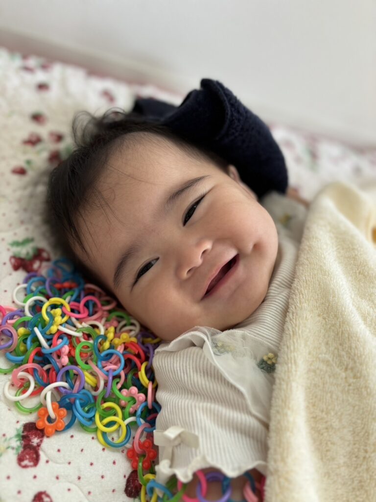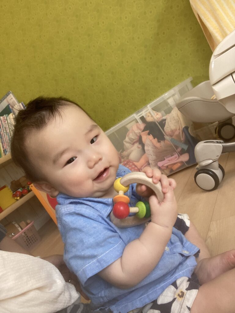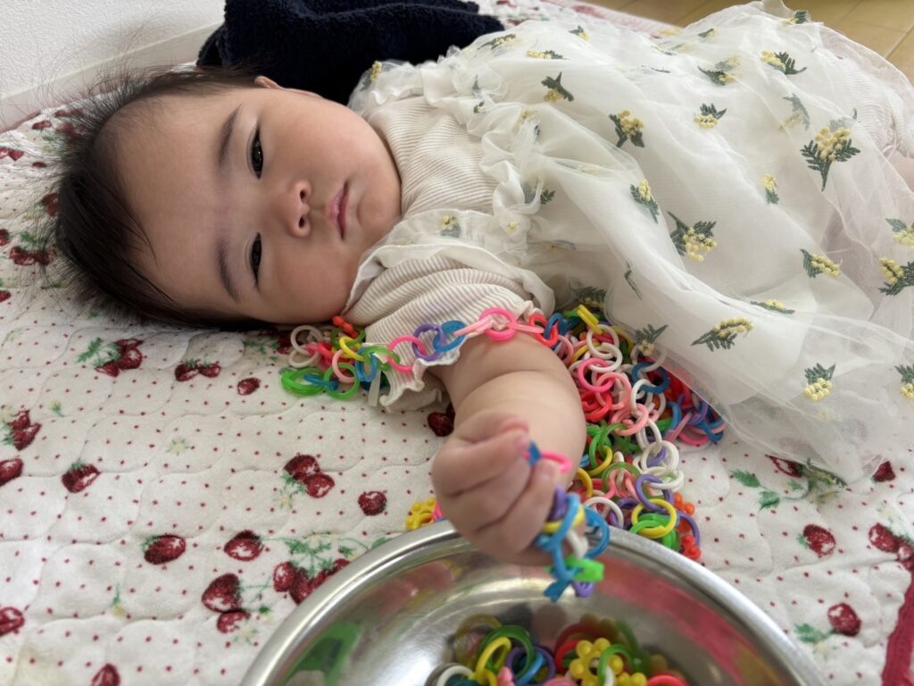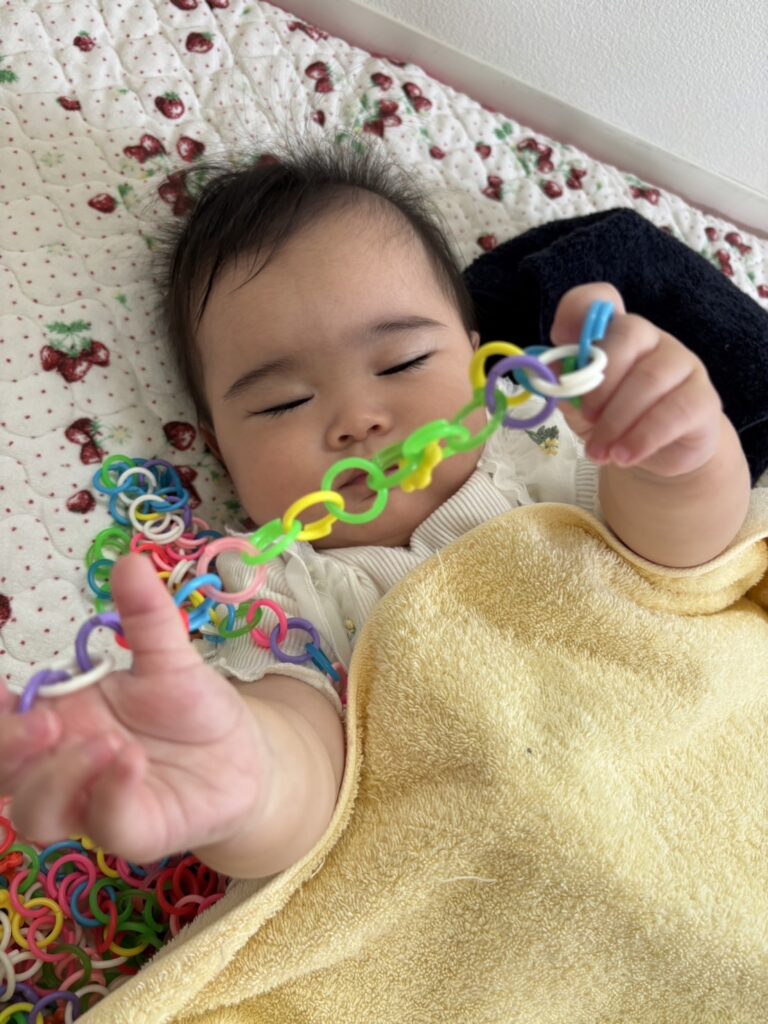 でも抱っこで落ち着いて、おやつを少し食べた後、おもちゃへ手を伸ばして遊び始めました♪