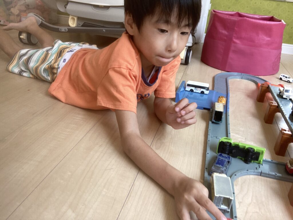 「事故があって…ここの道は混んでいて通れない…」と自分で考えたストーリーで、トミカを動かしていました