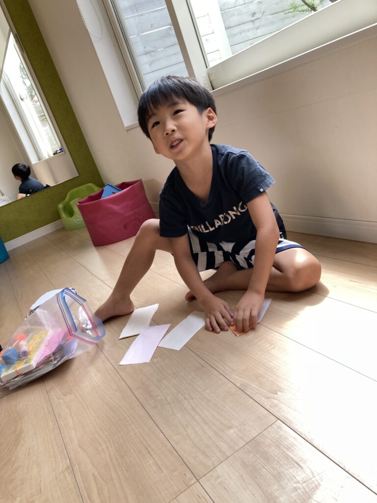 工作セットが入っているバックをご持参^_^ カエルを作りたいと、折り紙を上手に ほどいい大きさにちぎっていました