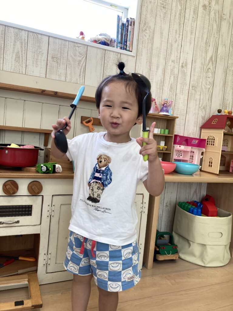託児に入室するとすぐにおままごとでご飯を作ってくれます