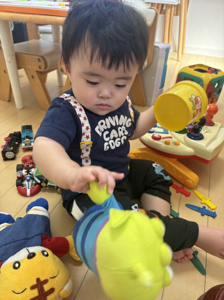 おもちゃに興味がたくさんあり、次々と手に取り、音を鳴らしたり、カップに入れたりと大忙し