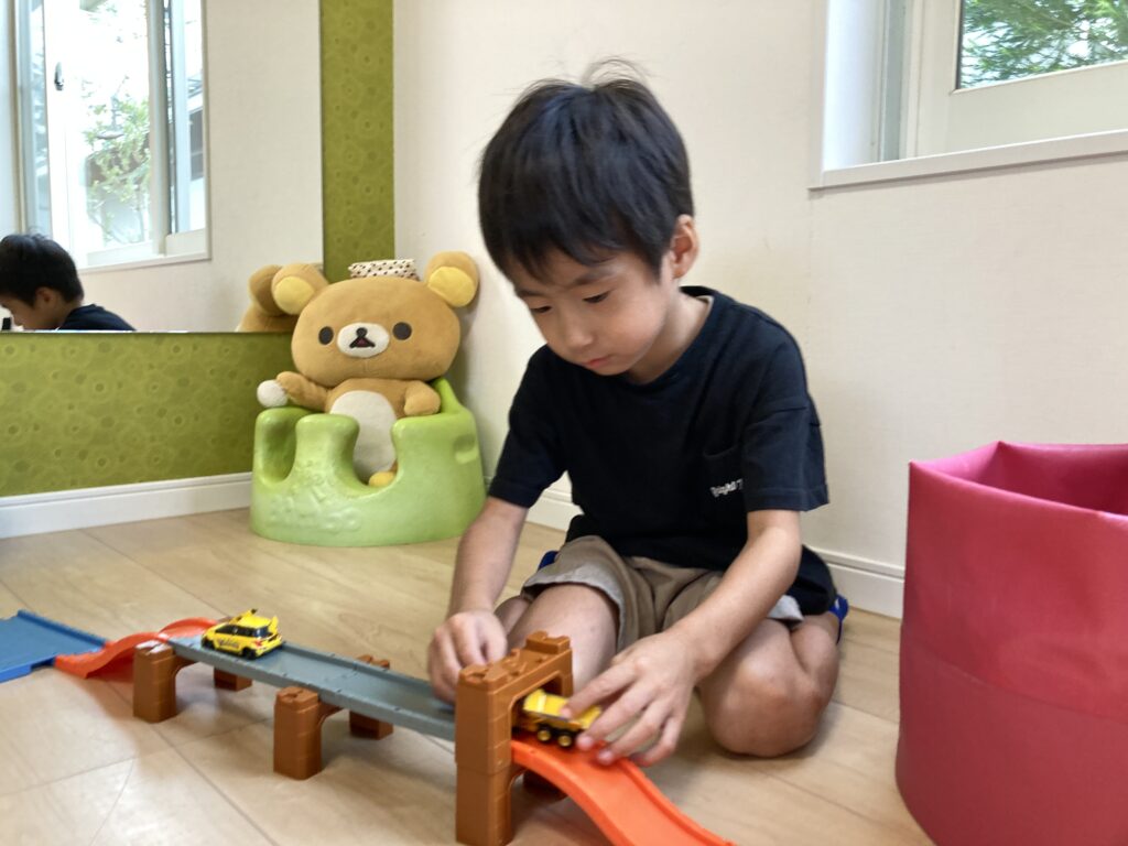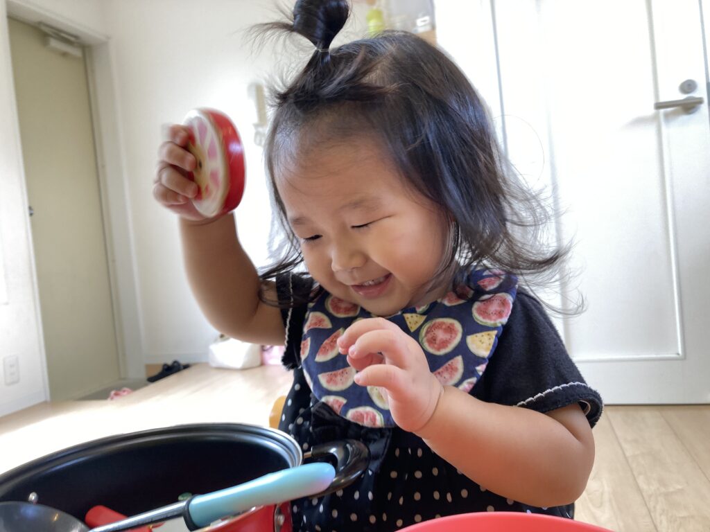 お母様は人見知りをご心配なさっていましたが、入室してすぐに ちょこんとイスに座って、おままごとで遊び始めました♪