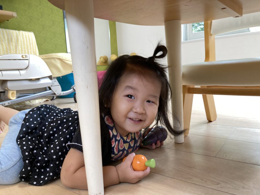 お昼ご飯をしっかり食べて、その後はあちらこちらへ移動しては、歌に合わせてダンスをしたり、机の下に入ってくぐり抜けたり…ご機嫌に遊びました