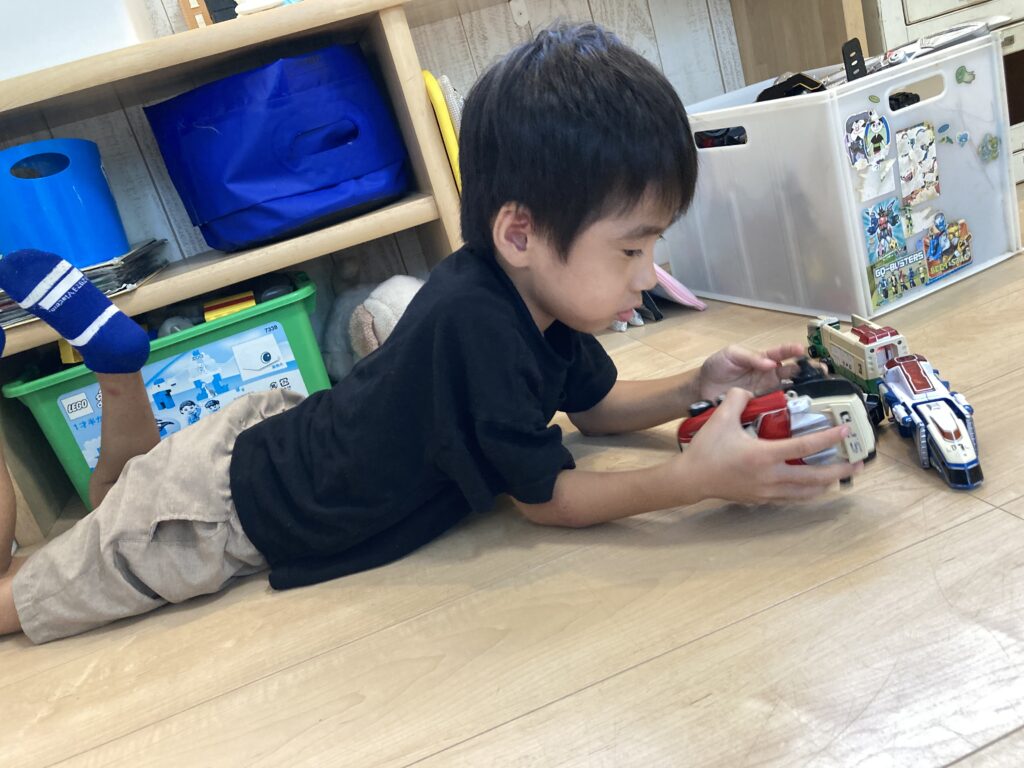 戦隊のおもちゃのロボットを、組み立てたり崩したり…何度も器用な手つきで楽しんでいました♪
