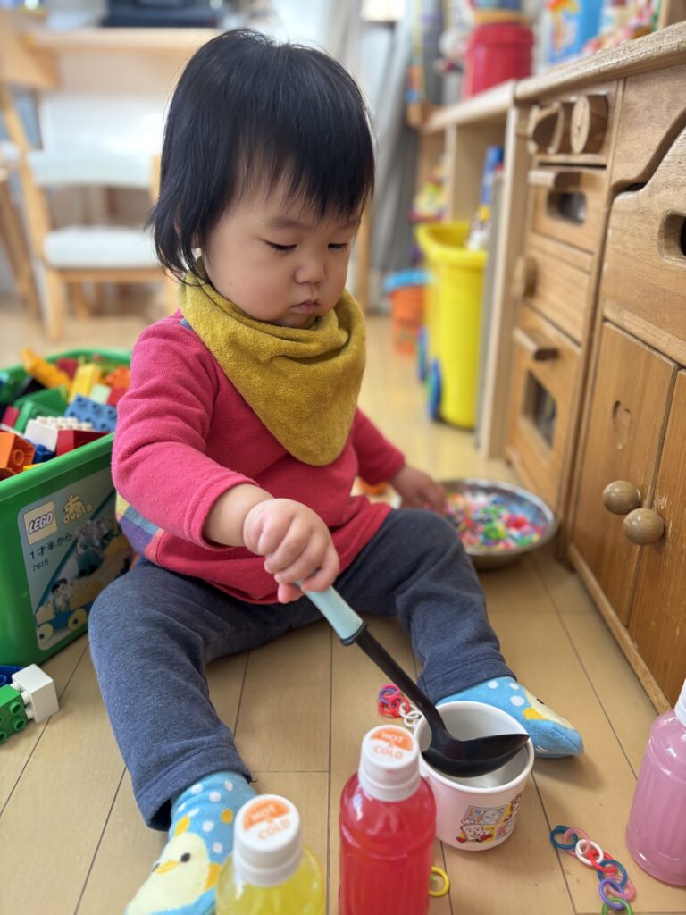 お友達の遊ぶ様子につられるように、少しずつマネして遊び始めました♪
