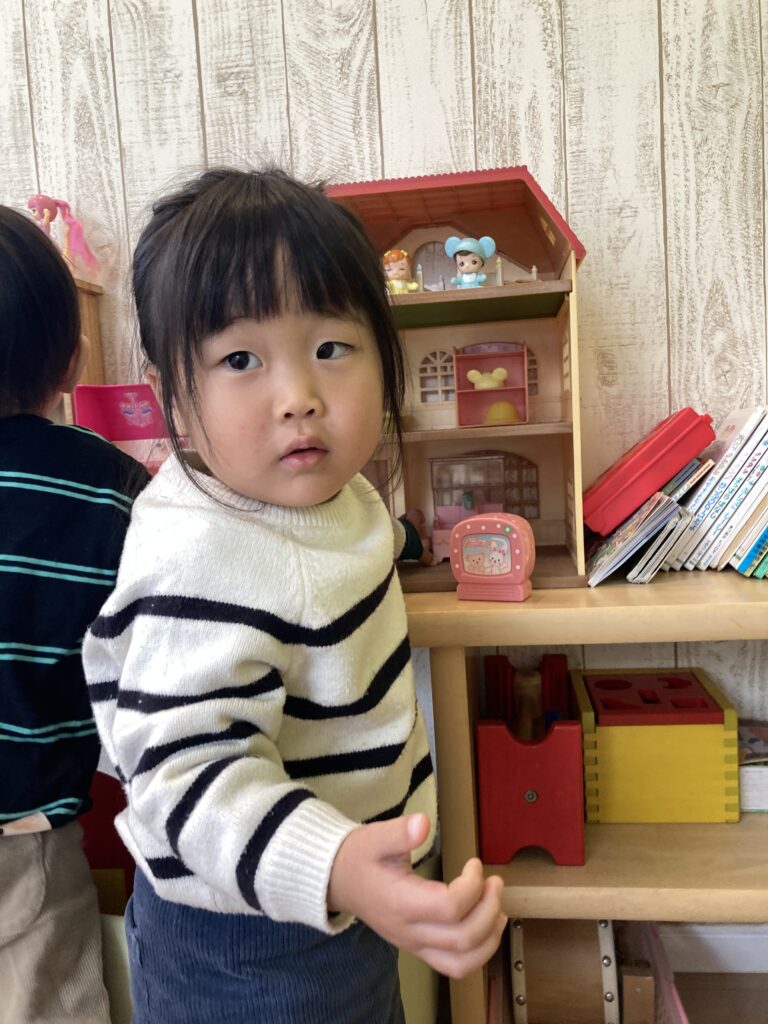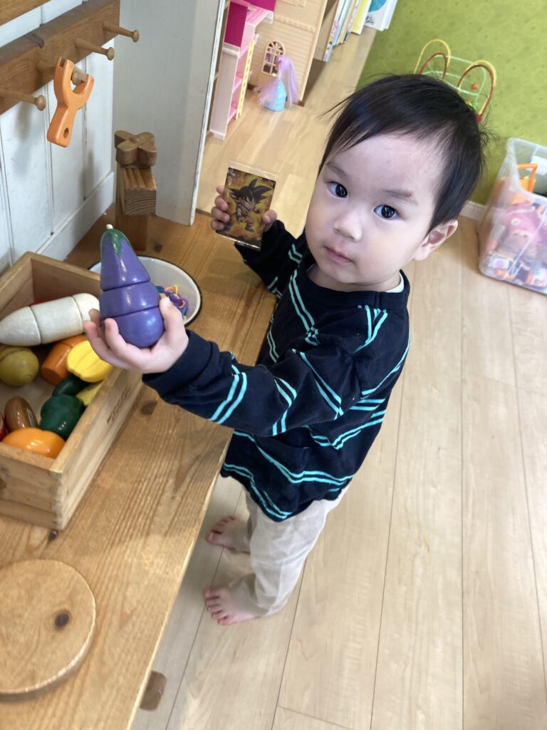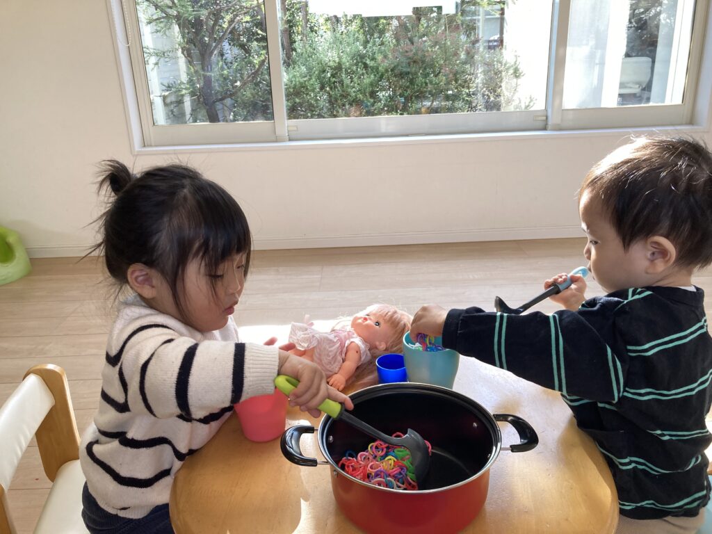 おままごとのおもちゃが楽しかったみたいで、お友達に「どうぞ」してもらって、遊んでいました