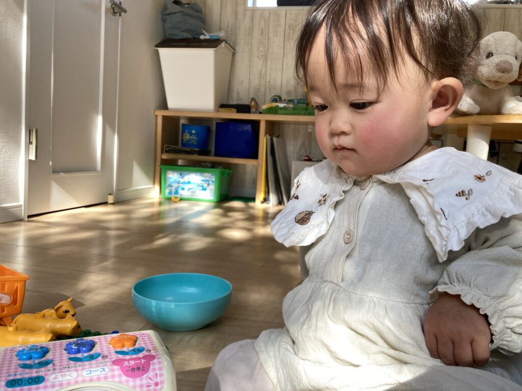 お昼寝して、起きたあとはお昼ご飯。その後落ち着いてからは、おもちゃのボタンをポチポチ楽しみました