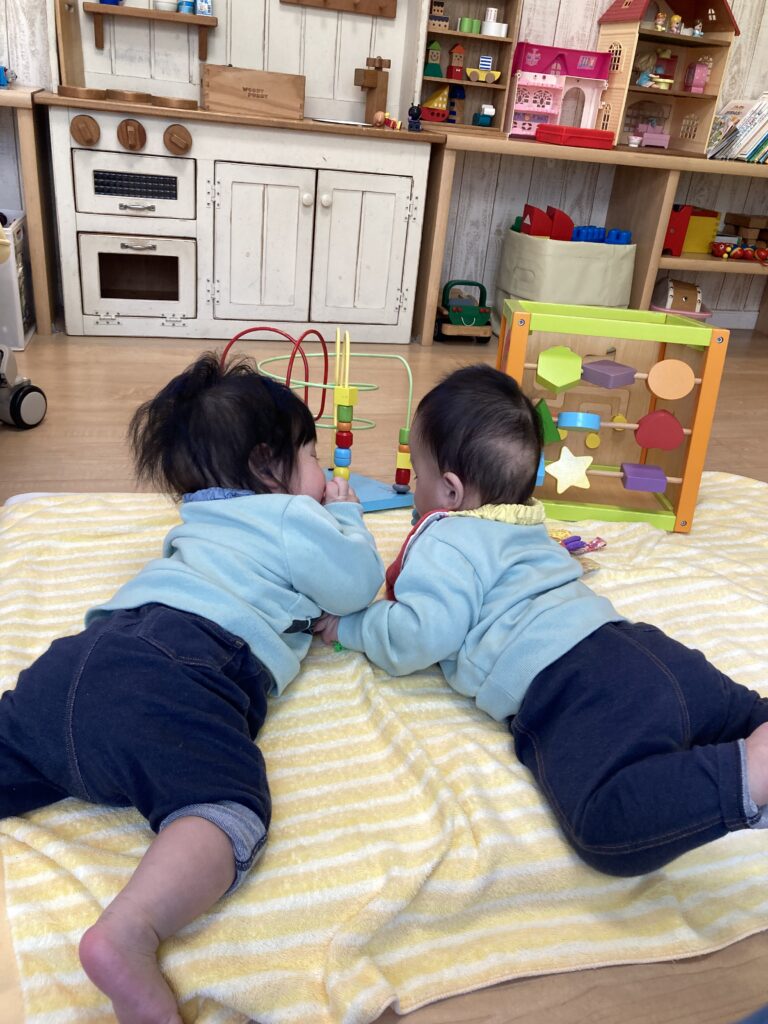 前回はまだねんねでしたが、お二人ともずりばいできるようになって、お目当てのおもちゃへジリジリと近付いていました^_^