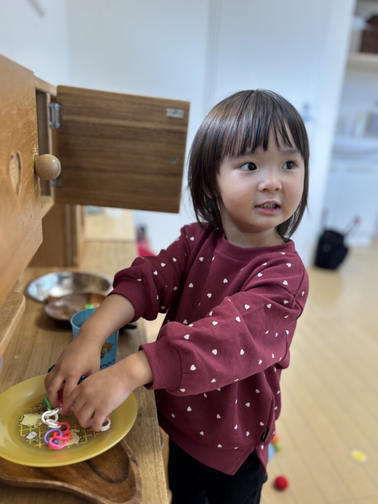 にこにこ笑顔で入室してくれました。おままごとのおもちゃで遊んでいました♪ 鏡も大好きで、ご機嫌でした!