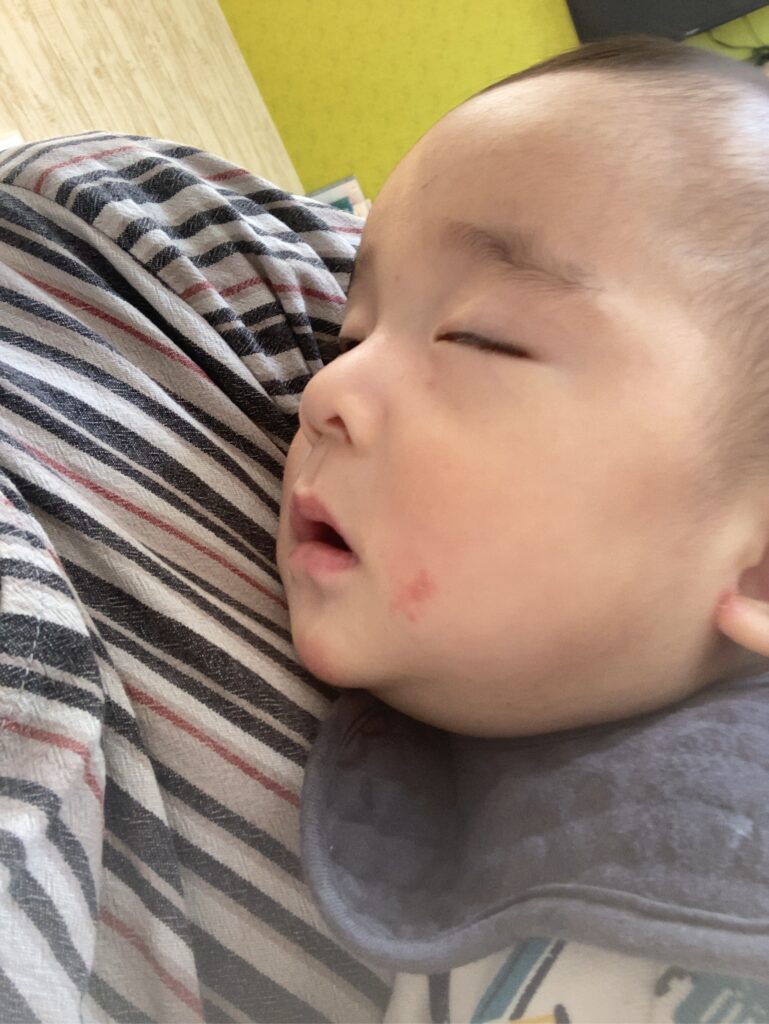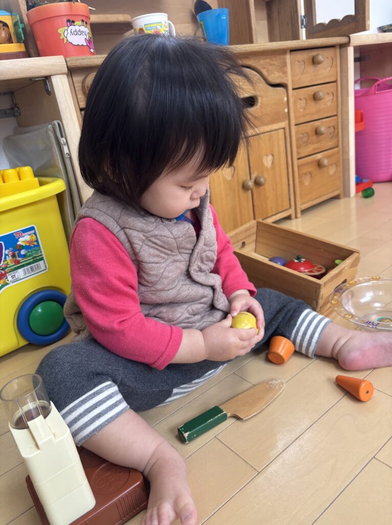 ミルクを完飲した後、そのままお昼寝しました…ひと眠りしてスッキリ!目が覚めてから、遊んでいました