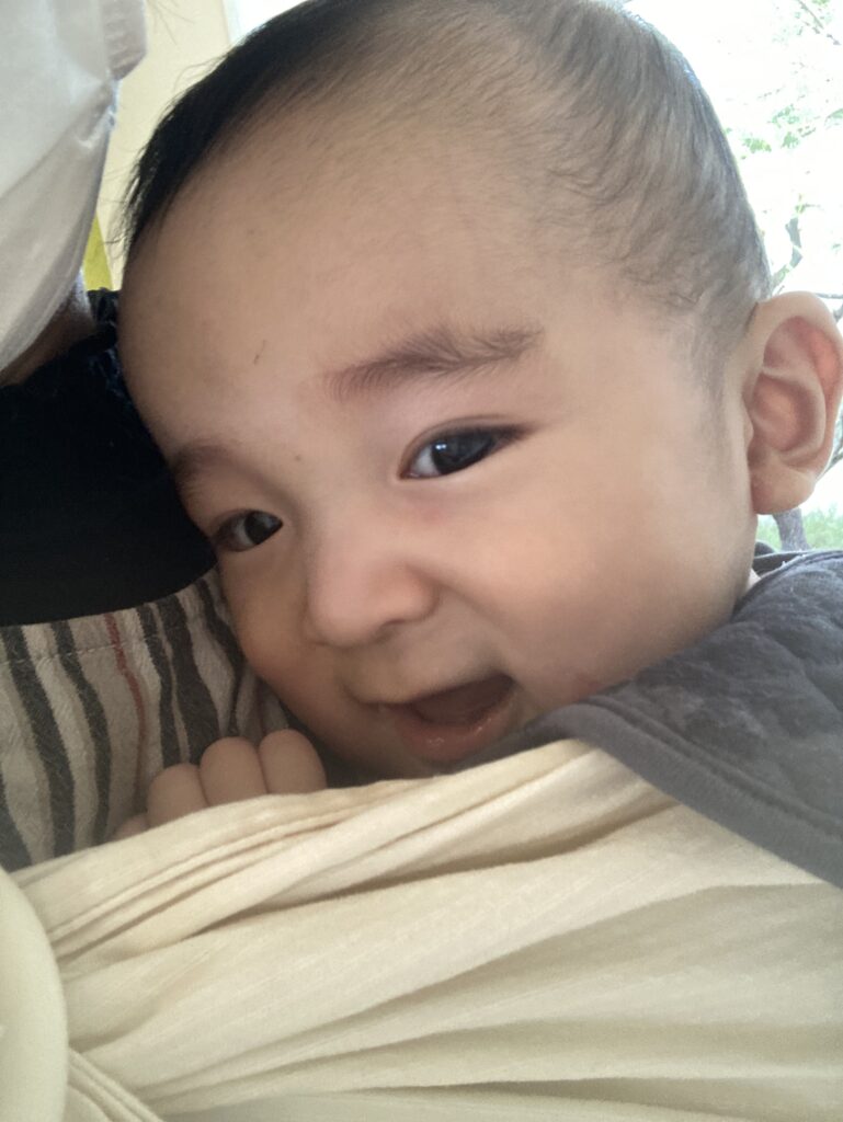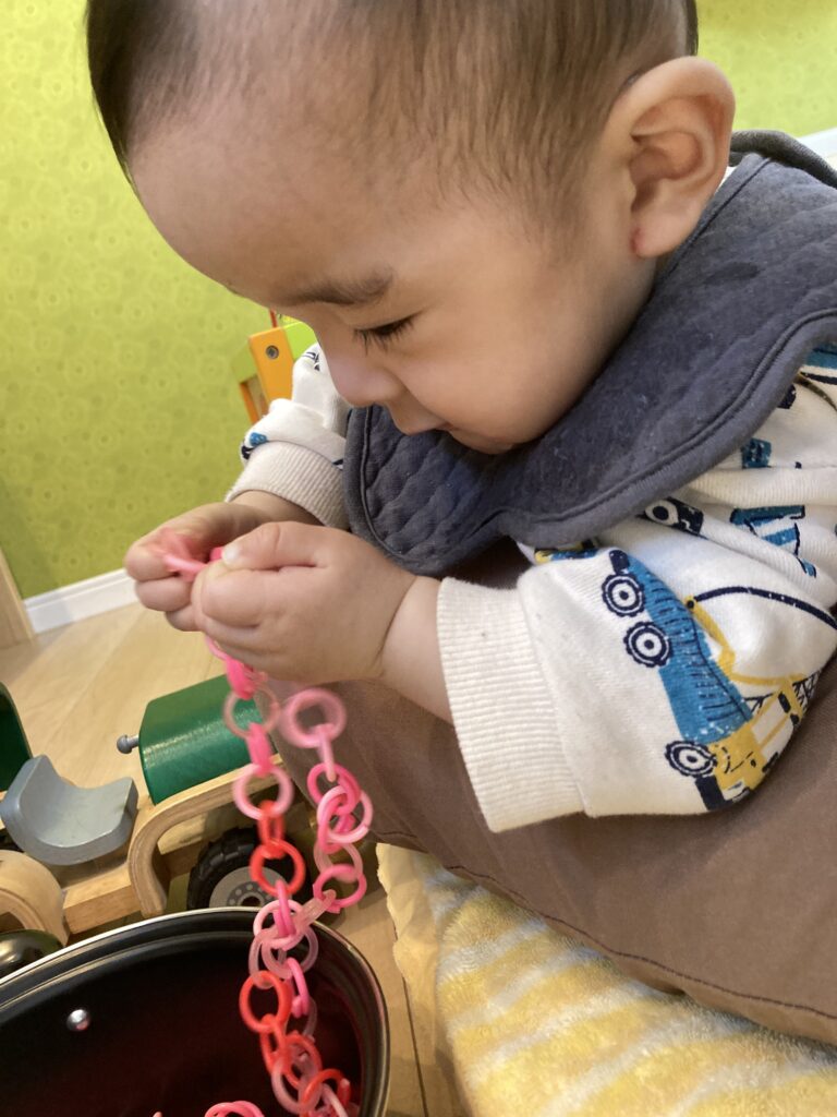 だんだん落ち着いていって、おもちゃを勧めるとイヤイヤしていたのですが、カーテンのヒモやインターフォンのヒモには手を伸ばしていました^_^ お子様って、小さいながらも本物志向ですよね…