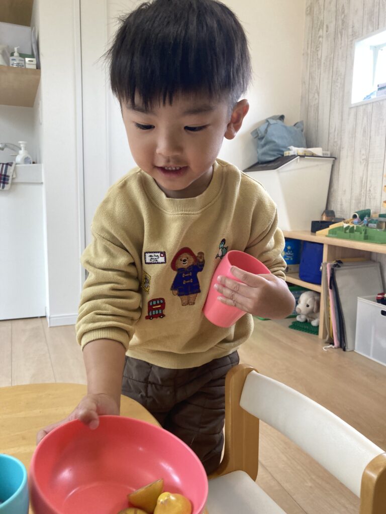 笑顔いっぱいになりおままごとを中心に黙々とおままごとキッチンでお料理を作りできたらもってきてくれました。