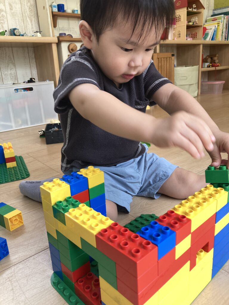 「ブロックおもしろいなー」と言いつつ、夢中になって、レゴを積み上げていました