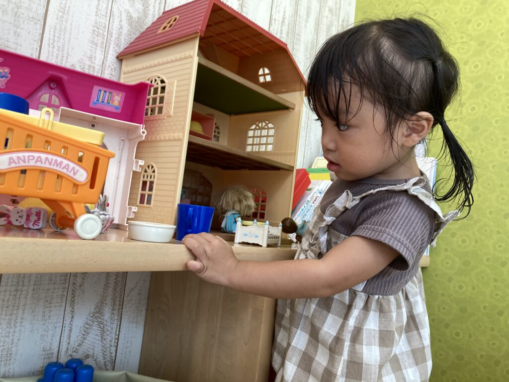 積み木や、物を出し入れするのがお好きとのことなので、形ハメのおもちゃを勧めたら、ニコニコでとっても上手に遊んでいました