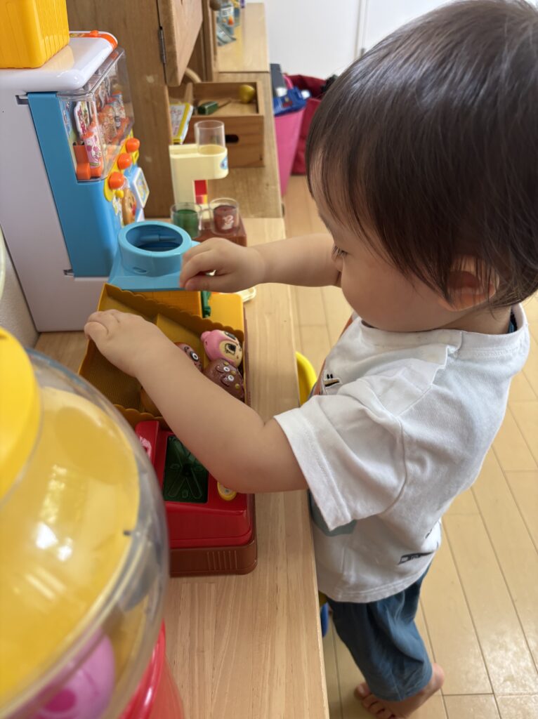 1歳さん、泣きながら入室しましたが、お母様がドアを閉めたら気持ちがしっかり切り替わったようで、スッと泣き止んでスタスタとキッチンへ行き、遊び始めました♪