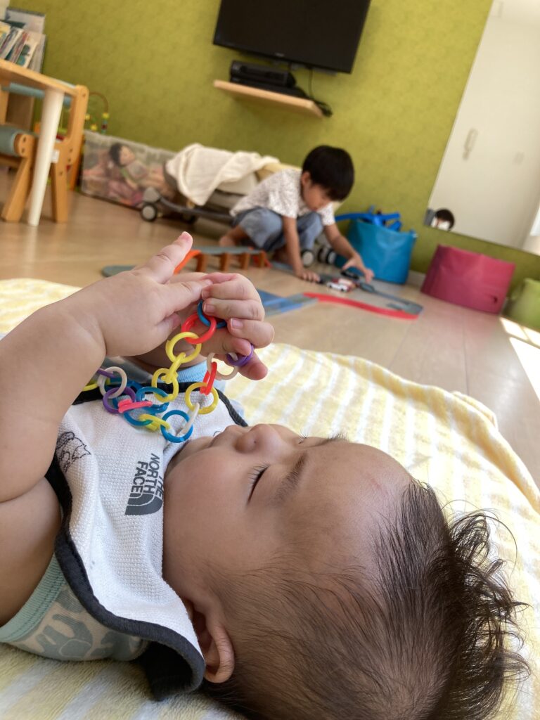 4ヶ月さん、入室して布団の上で、ご持参したお気に入りのおもちゃで遊んだり、お兄ちゃんが遊ぶところを見て、ご機嫌に過ごしていました