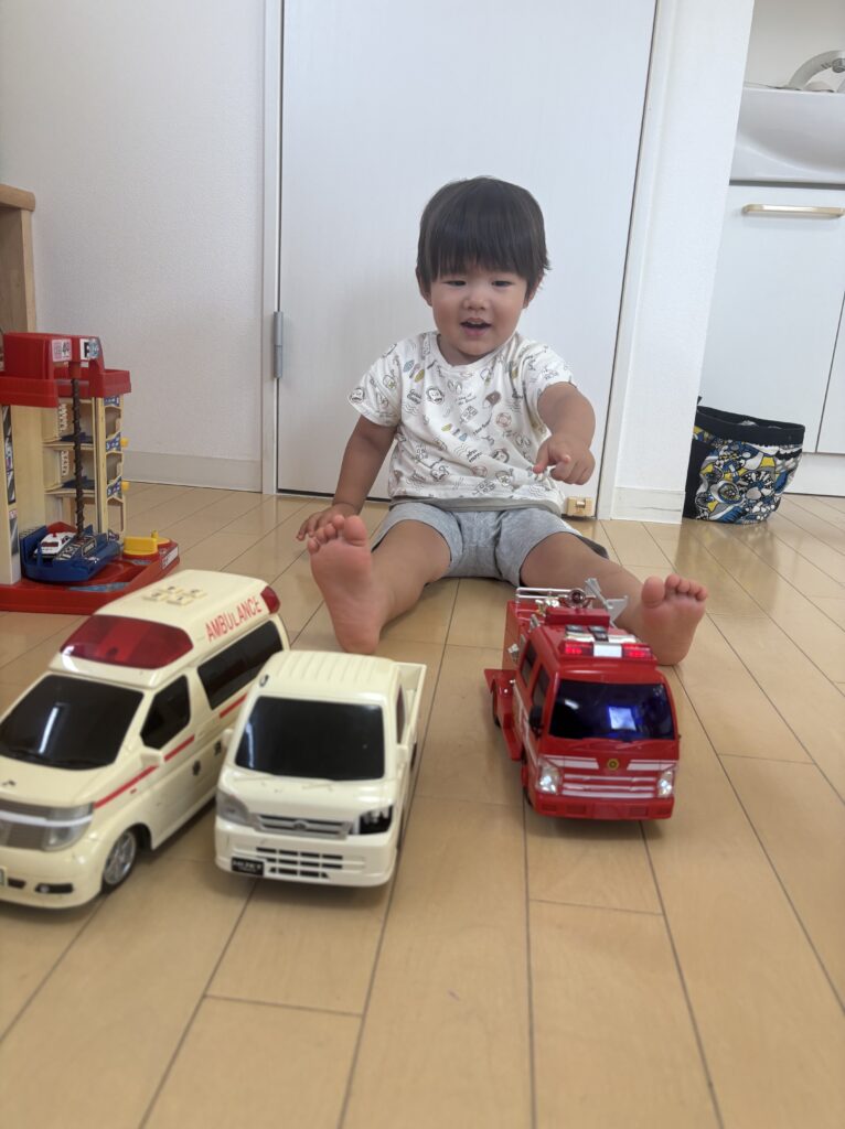 寝起きということで少しボーッとした様子で入室しましたが、すぐにいつものおしゃべりと大好きなトミカで遊び始めました。