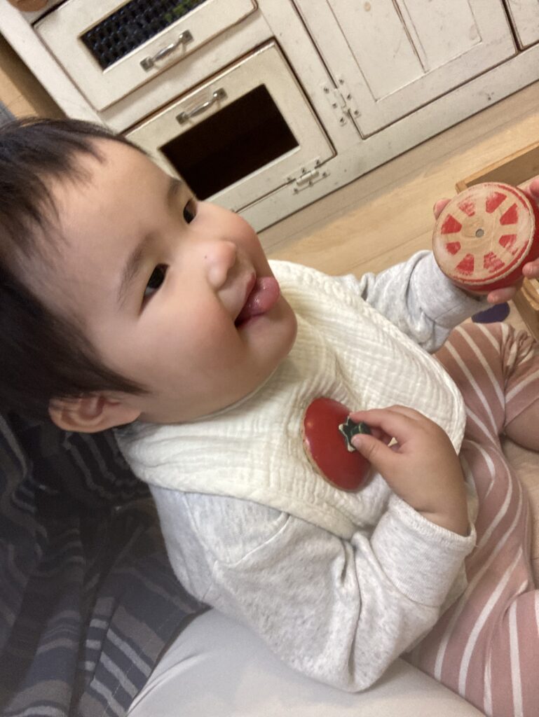 でもすぐに泣き止んで、おままごとの野菜のマグネットで遊び始めたら、とってもいい笑顔になりました♪