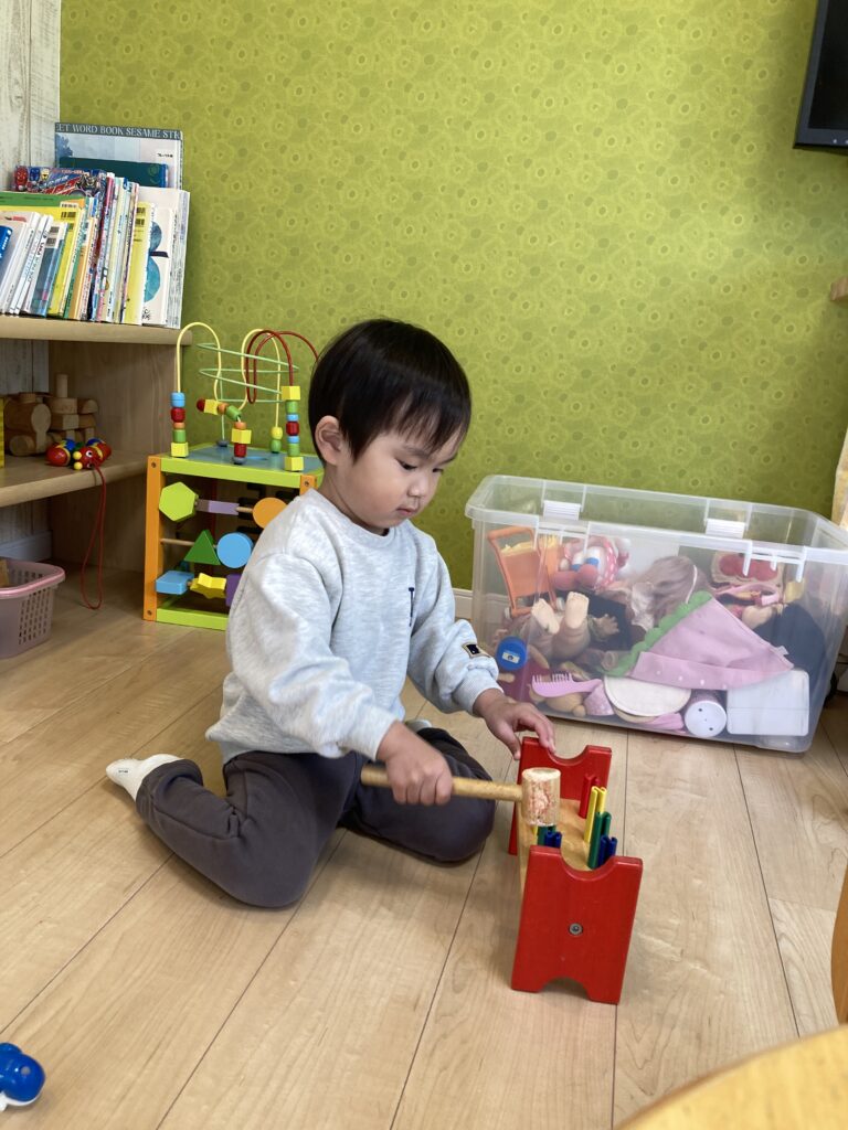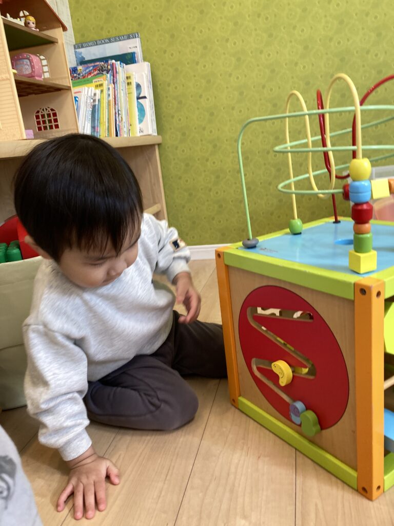 遊びたいおもちゃがあちらこちらにあるようで、移動してはちょこんと座って遊んで、また移動して…と元気に遊んでいました♪