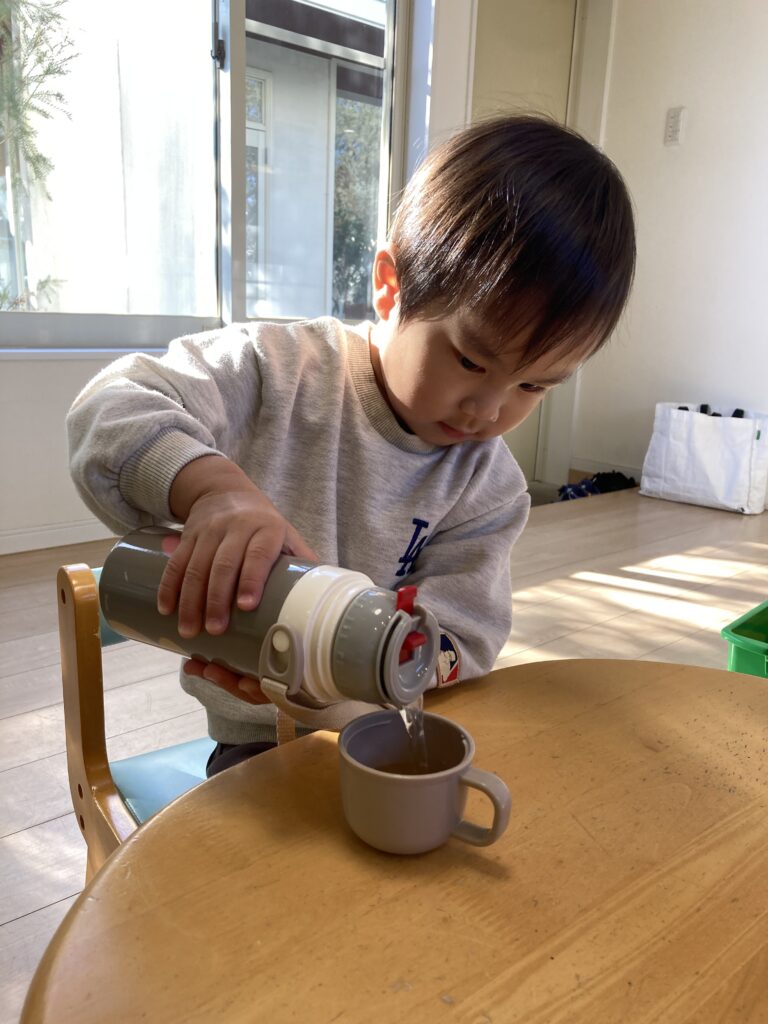 水筒でコップにお茶をそそぐ練習を、今頑張っているそうです。とっても上手でしたよ!