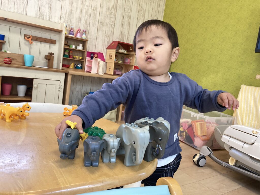 とても好奇心いっぱいで、すぐにおままごとやレゴブロックで遊び始めました♪ レゴではゾウを「パォーン」と鳴き声をマネっこしながら、向きを揃えて並べていました