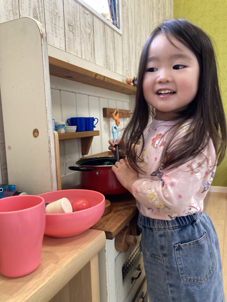 妹ちゃんのために「ごはんをつくるよ。ピンクのお皿にしよ」とお話ししながら、お料理していました