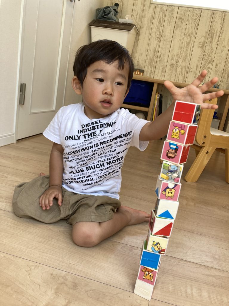 靴を脱ぐのももどかしい様子で、勢いよく入室してくれました!しまじろうパズルを私が積み上げると、倒さないように集中しながら、ひとつひとつ そっと取る遊びも楽しみました〜