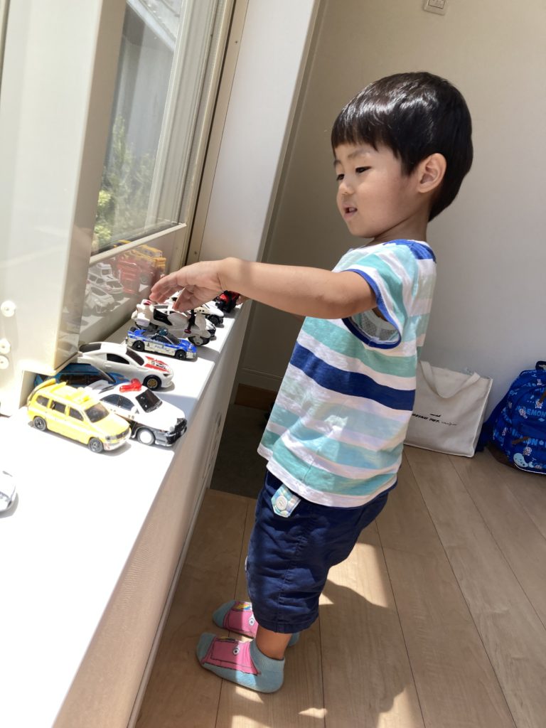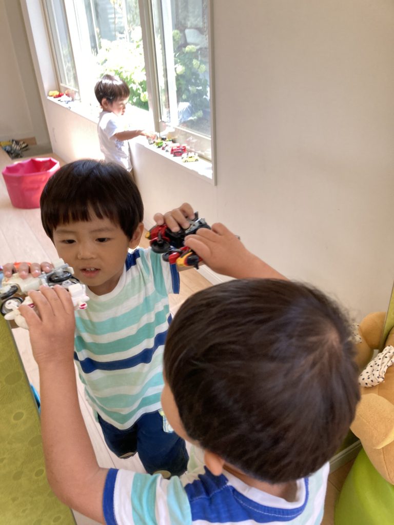 トミカが大好きで、たくさん出しては 走らせたり、じっくり見て遊んでいました♪ お友達と「まてまてー」と、走ったら楽しくて 笑顔もいっぱいでした!