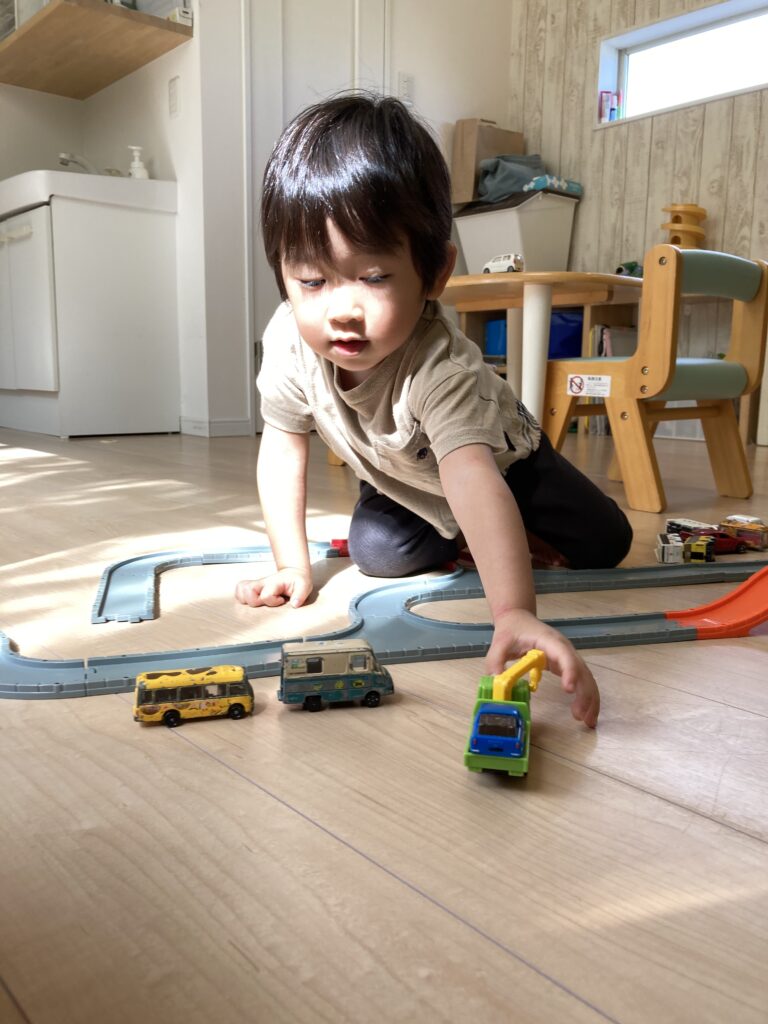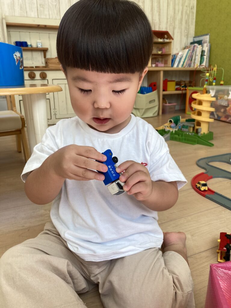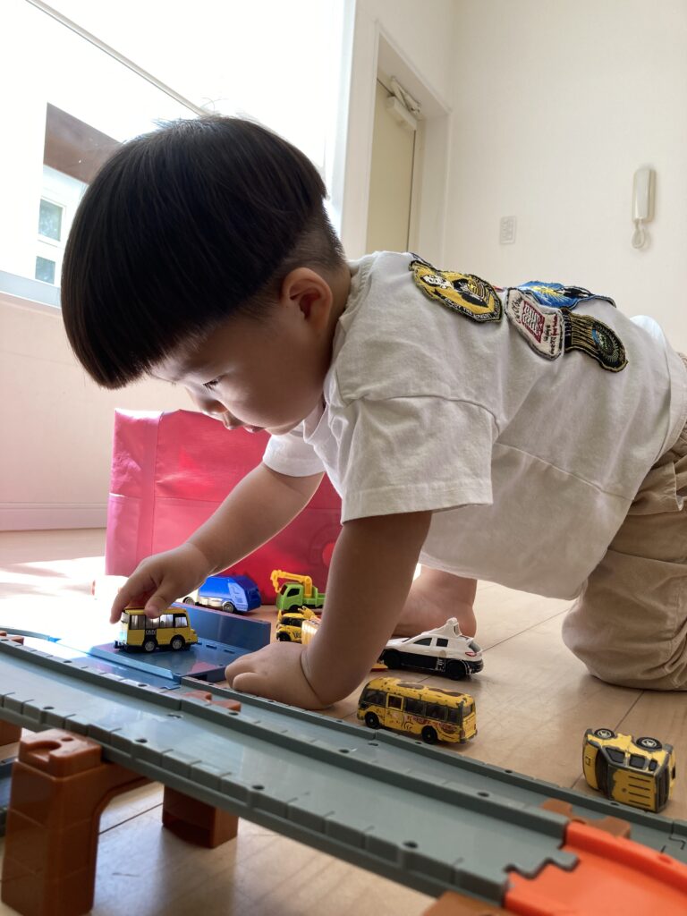 後追いの時期とのことで、お母様にくっついて泣けていましたが、お母様の姿が見えなくなると、ピタッと泣き止んで、大好きなトミカで遊び始めました♪