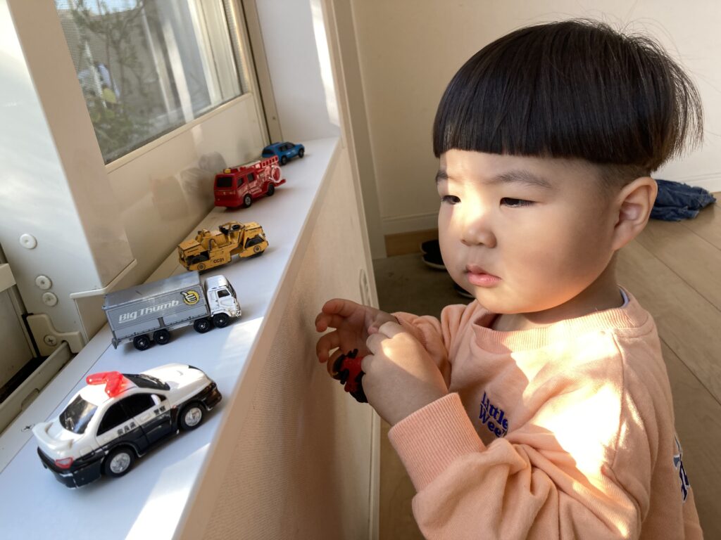 窓枠にトミカを準備しておくと、毎回入室してすぐに遊んでくれます♪