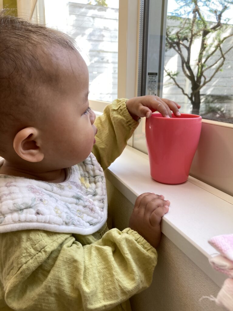 抱っこイヤイヤ降りる!という感じだったので、窓辺のところで一緒に過ごしていると、少しおもちゃに触れました。