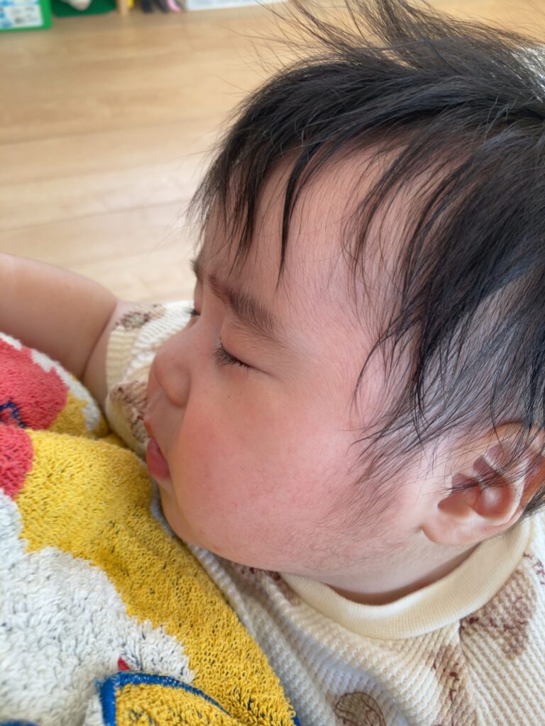 お母様を呼ぶように「えーん…」と少しだけ泣いて、小さなあくびをひとつしたら、すぐに うとうとお昼寝タイムになりました…