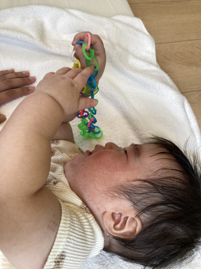抱っこからおりるのはイヤだったみたいで泣けたのですが、おもちゃを受け取ってくれて、遊び始めました