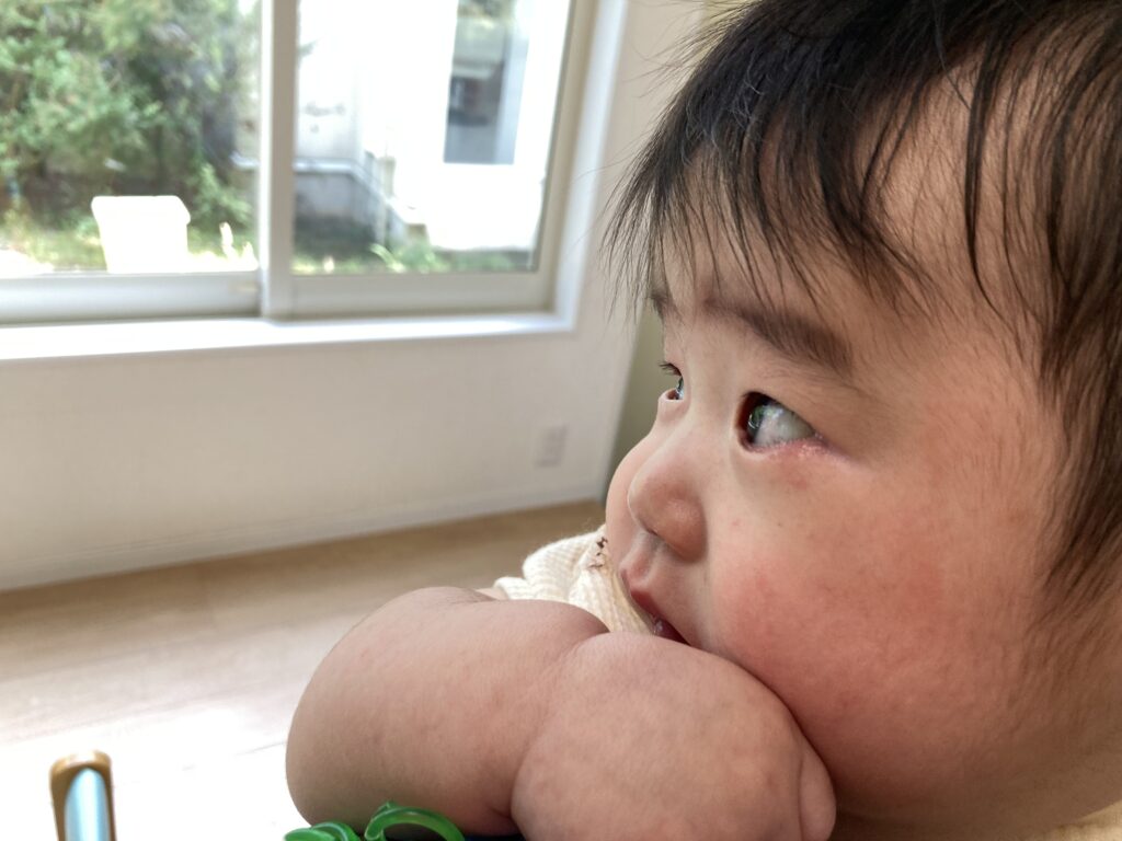 お昼寝の最中「起きそう…どうかな?起きるかな?それともまだ寝るかな?」を何度か繰り返して、まだ少し眠気がある様子ながらも起きたので、おむつ替えしました