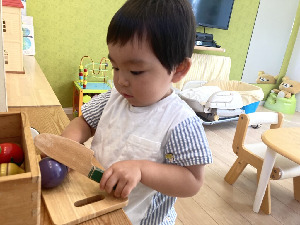 おままごとで野菜を切ったり、牛乳を注いだり…「ん!」「で!」とおしゃべりしながら、遊んでいました♪