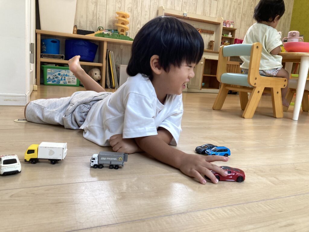 3歳さん、少しもじもじしていましたが、トミカが大好きとのことで、託児室のトミカを紹介したら、入室して遊び始めました