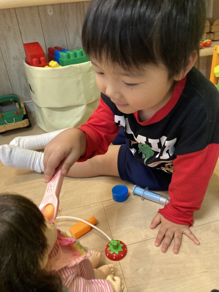 お医者さんごっこでは「どうしましたか?」と優しく聞いてくれて、「少し熱があるんです…」と答えると「それなら…寝たら治りますよ」「はい、しっかり食べてね」と…なかなかリアルな診察結果を言ってくれました^_^