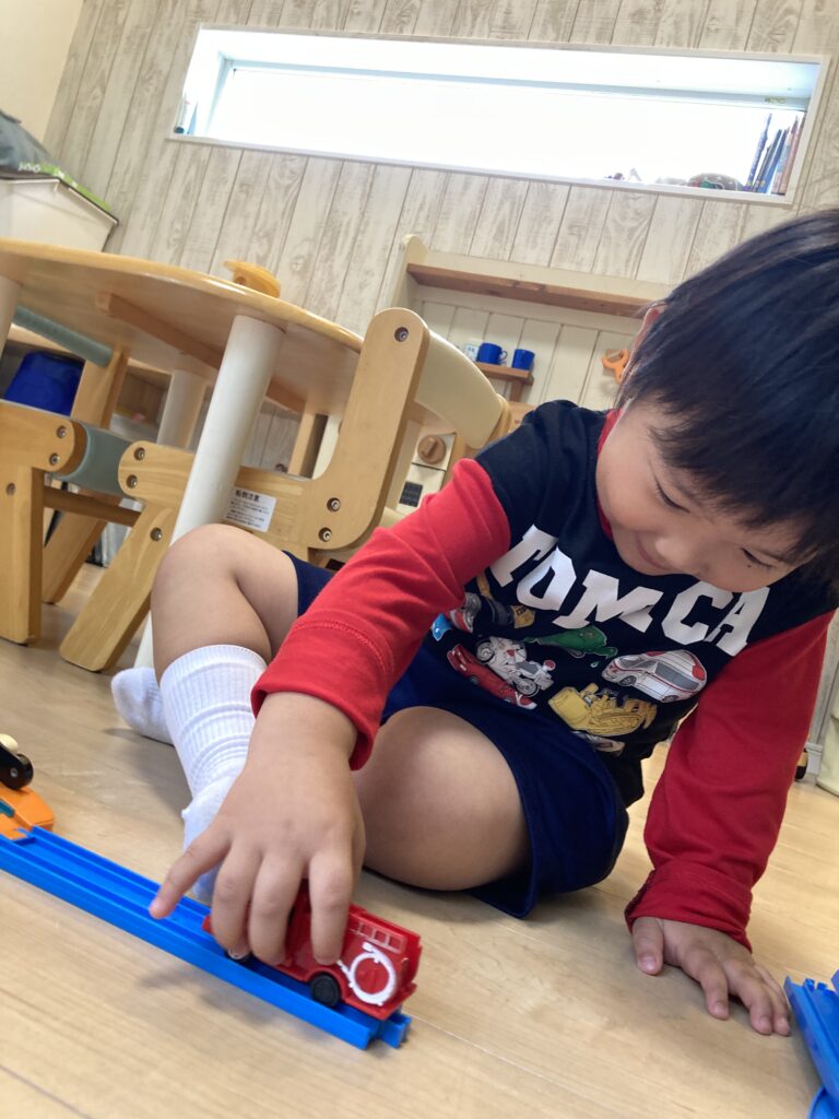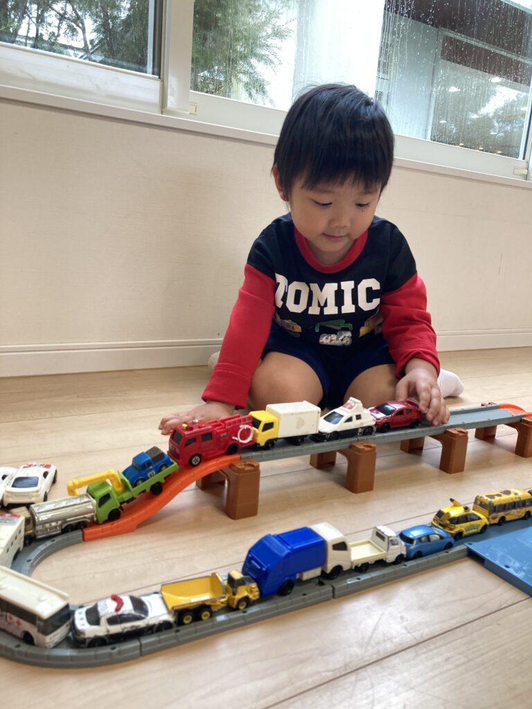 トミカを「渋滞だぁ!」と、たくさん並べて遊んだり、プラレールにトミカを使って遊んだり…ご機嫌な笑顔をいっぱい見せてくれました♪