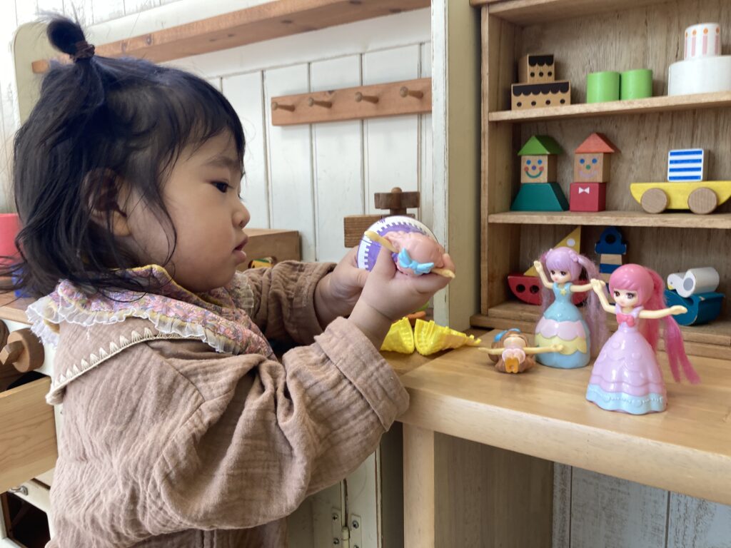 しっかり目が覚めたみたいで、遊び始めました♪ リカちゃんが好きで、じっくり遊んでいました