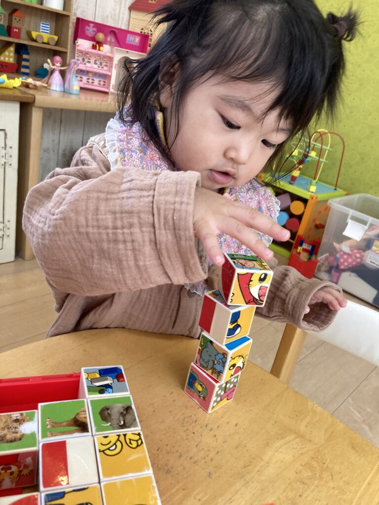 手先がとっても器用で、すすすっとしまじろうパズルを積み上げていました! 1歳半検診の積木ではきっとバッチリですね^_^