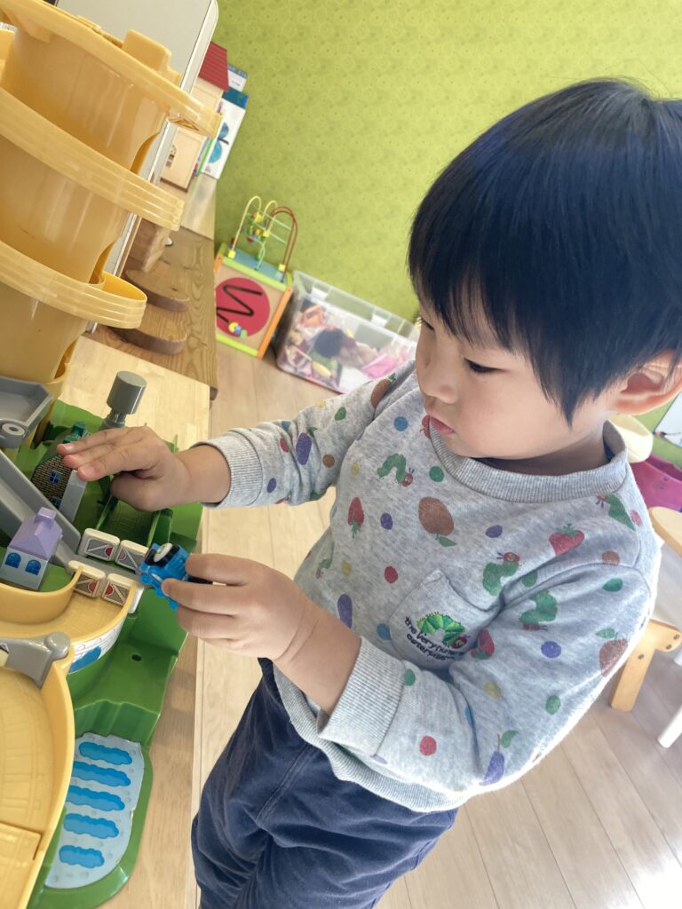 トーマスで遊んでそのまま横へスライドして…キッチンで遊んでさらにスライドして…ドールハウスで、黙々と…という様子で遊んでいました♪