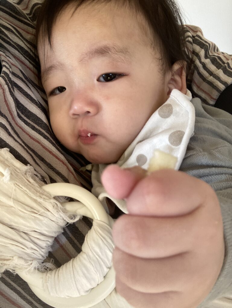 泣いて入室しましたが、すぐに落ち着きました。しばらくしてからまたウルウル泣けてきました…お母様からお聞きしていた時間よりちょっと早めにオヤツタイムにしました