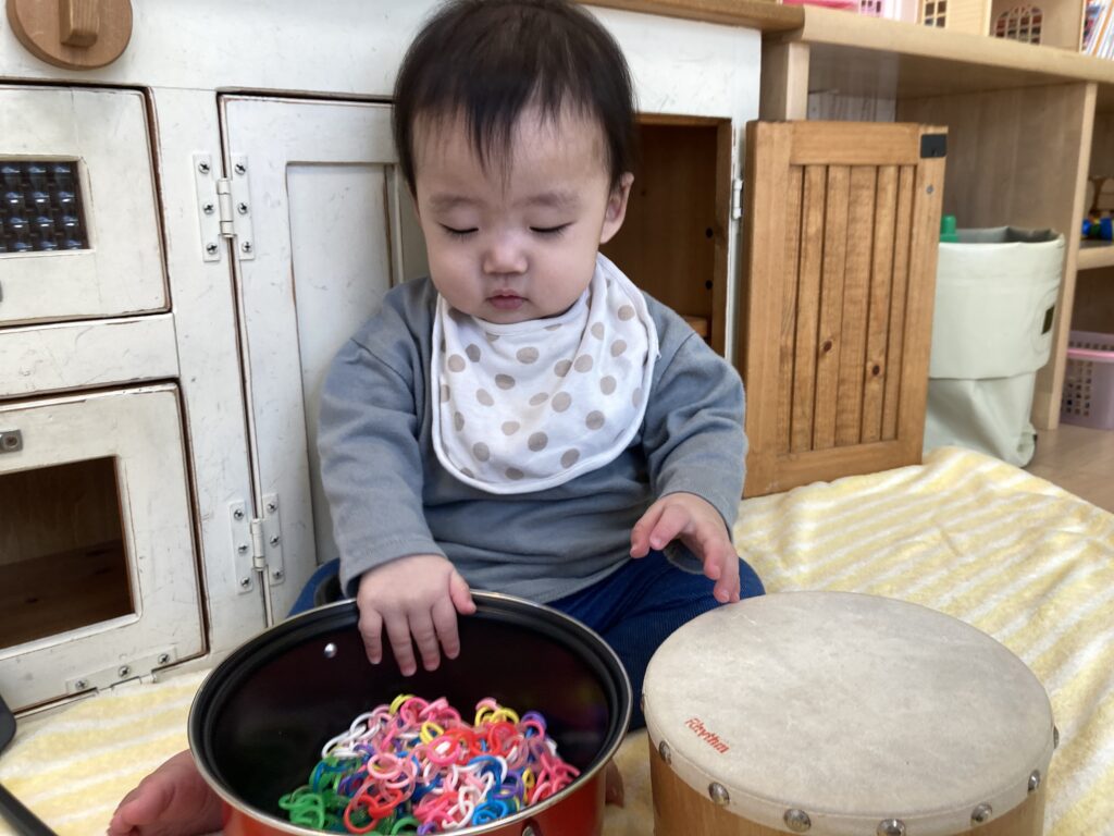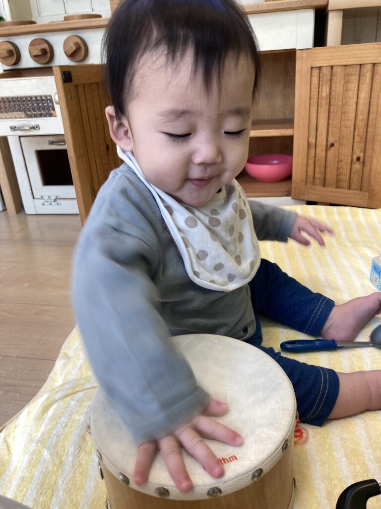 少しずつおもちゃで遊び始めました♪ 太鼓もトントンたたいてご機嫌でした